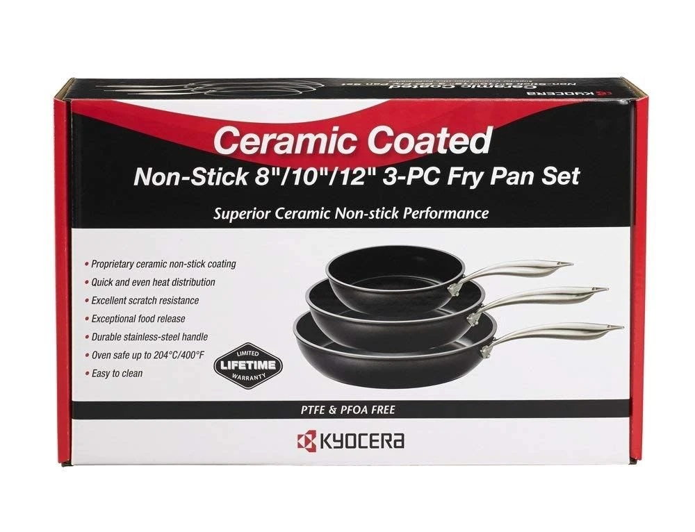 Fry up some crispy bacon, delicious eggs, or yummy hashbrowns in this Kyocera Ceramic Non-Stick 3pc Fry Pan Set! The sturdy riveted professional stainless steel handle of the 8-in, 10-in, and 12-in fry pans allow you to multitask, getting a hot meal on the table quickly. The ceramic non-stick coating is PTFE-Free, PFOA-Free, and Cadmium-Free, guaranteeing your family’s safety. These fry pans are non-stick, scratch-resistant, and easy-to-clean so that you can use repeatedly throughout the day. Made of heavy gauge aluminum with a stainless steel bottom plate, this durable fry pan set is oven-safe up to 400°F and ensures quick and even heat distribution. Whether you are cooking up breakfast for dinner or creating family recipes, your new Kyocera Ceramic Non-Stick 3pc Fry Pan Set with an 8-in, 10-in, and 12-in fry pan will serve you and your family well for years to come.