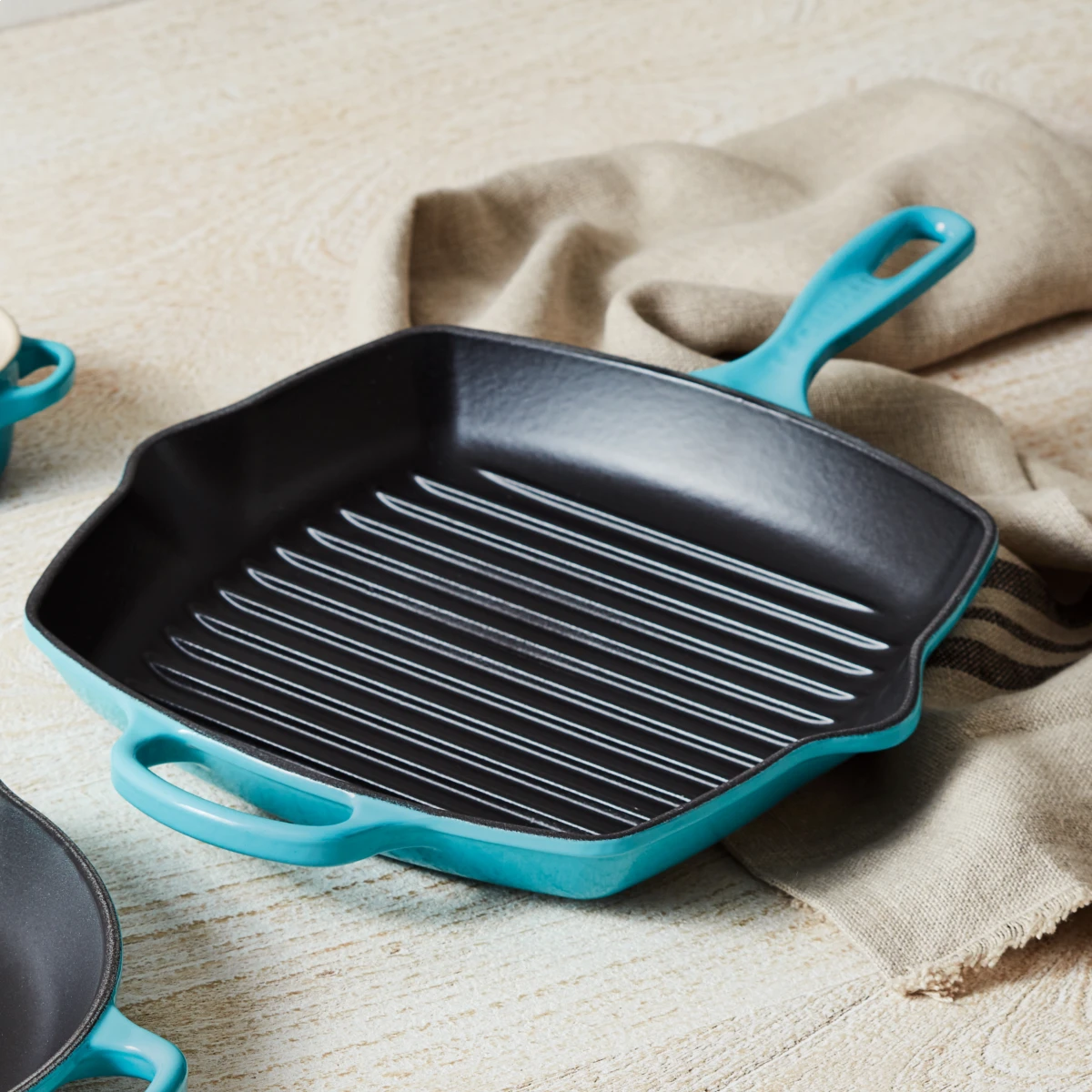 Grill delicious steaks, salmon, burgers and more all from the comfort of your own kitchen with the 10.25” Signature Square Grill Skillet in Caribbean Blue from Le Creuset. The high ridges of this enameled cast iron grill pan allow for the drainage of excess fat, assuring your food won’t become a greasy mess. The two spouts on either side also make for easy draining. The interior enamel coating prevents any damage or wear, and as you use it, the stove top grill skillet develops a natural patina that is perfect for searing. The full cast iron construction makes for a skillet with superior heat distribution and retention. The colorful Caribbean Blue enamel finish is both chip and crack resistant, which lends to this product’s durability. The helper handle opposite to the long handle is useful for carrying the grill pan between the table and stove top. Get your outdoor grilling fix with all the convenience of cooking indoors and go with Le Creuset!
