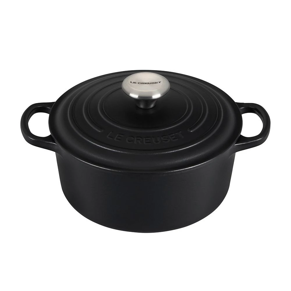 Surprise the whole family with a hearty roast made tender in Le Creuset’s moisture-retaining 3.5-Quart Round Dutch Oven in Licorice from the Signature Series. This beautiful round Dutch oven stands out with its beautiful chip-resistant enamel that lets you enjoy its beauty and quality for years to come. The modern textured design & sleek sophisticated matte black finish coordinates well with other Le Creuset cookware pieces in the Licorice Collection or mix & match with any other Le Creuset color collection for a bold look.