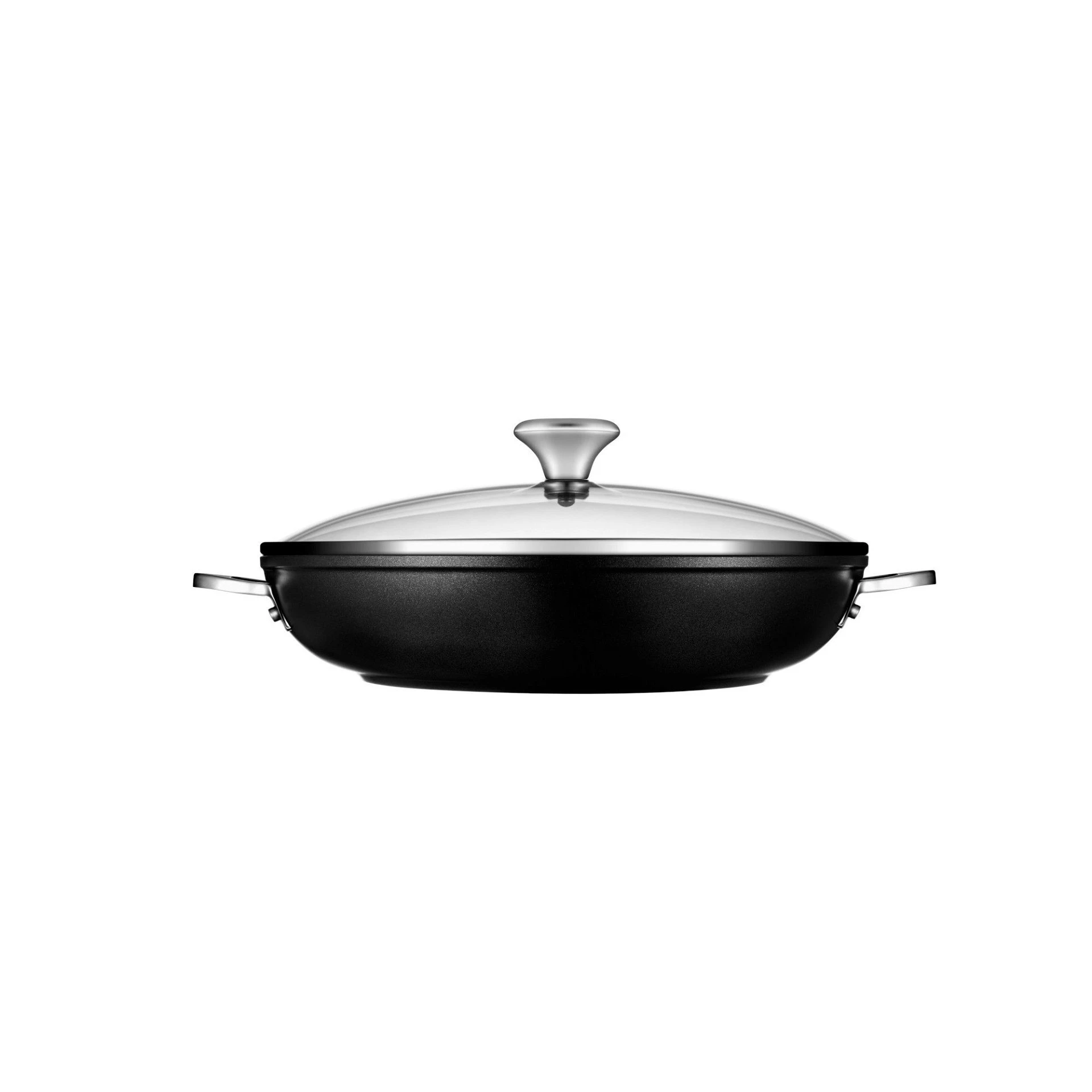 Surprise the whole family with a tender roast and juicy vegetables dishes on a quiet weekday night with Le Creuset’s 4 Quart Toughened Nonstick Pro Braiser with Glass Lid! This stunning black brasier stands out with its hard-anodized, fully encapsulated aluminum core that conducts heat quickly and evenly.