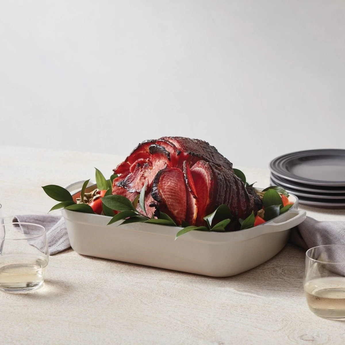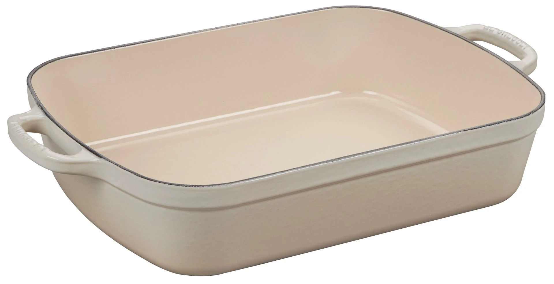 From family lasagnas to oven-roasted chicken breasts, serve up spectacular meals in Le Creuset’s 5.25 Quart Cast Iron Roasting Pan in Meringue. Made with durable cast iron, this roasting pan is made to provide even heat distribution while cooking your favorite family meals.