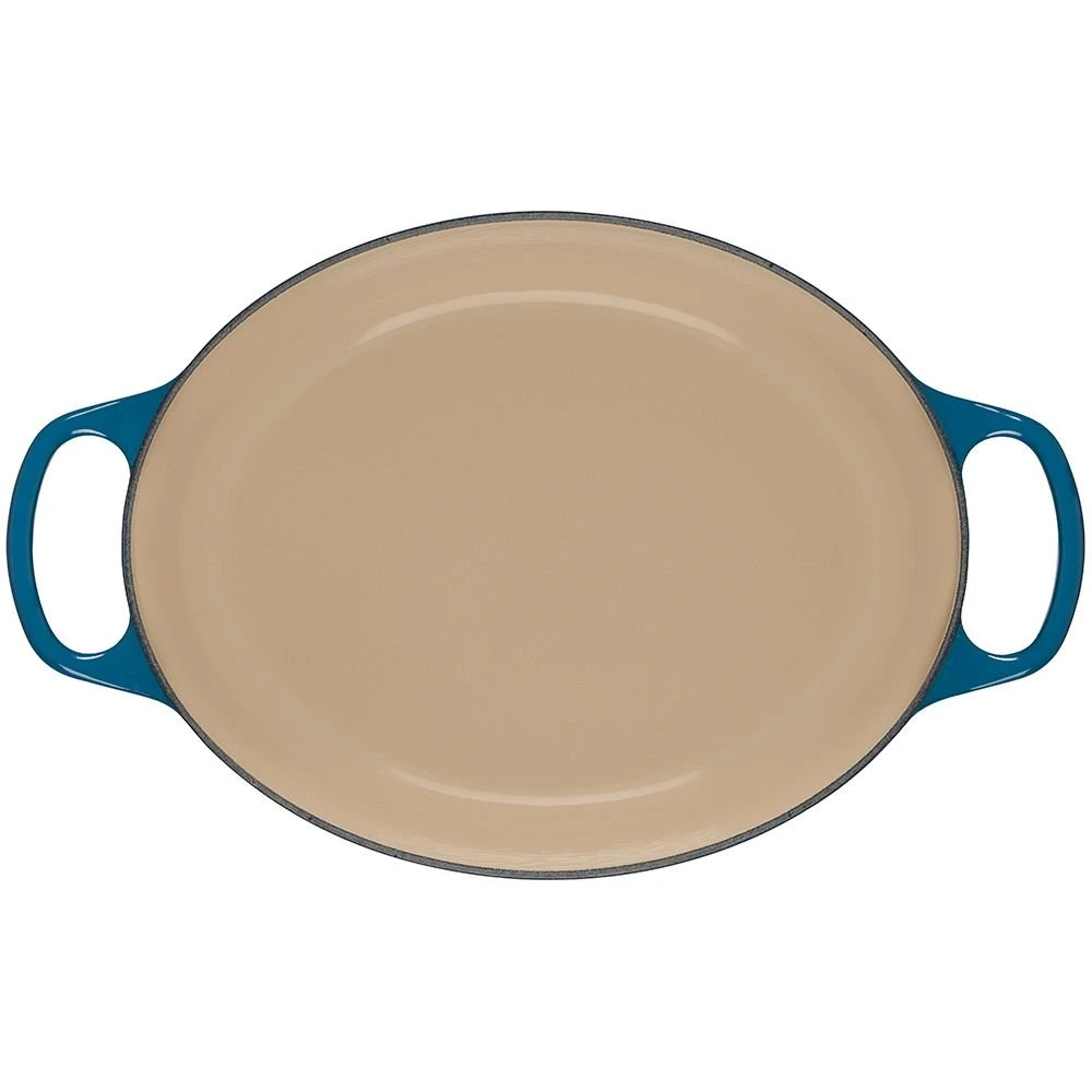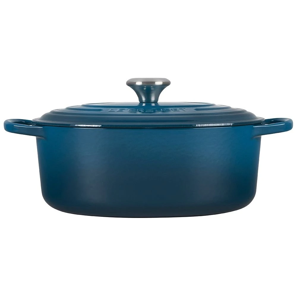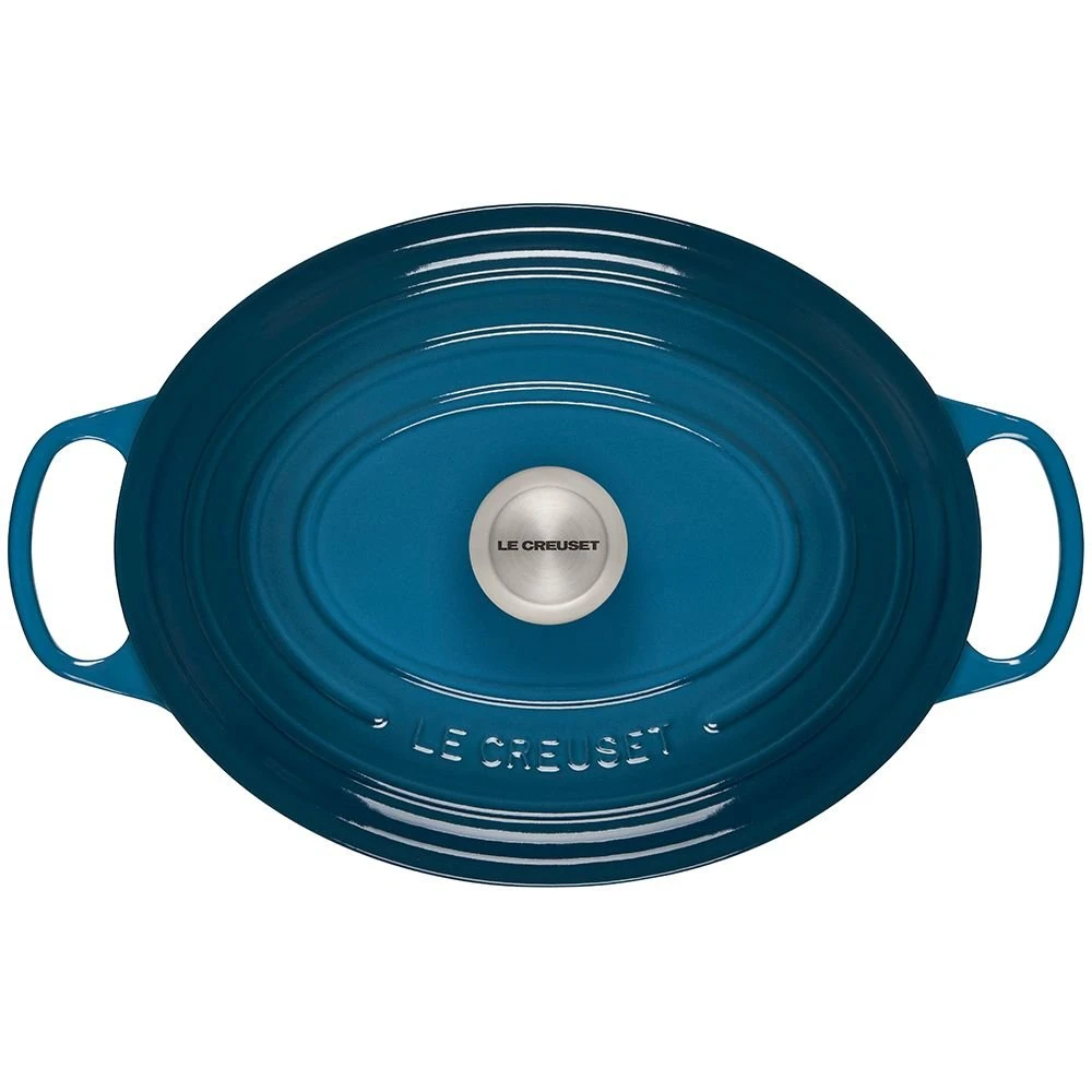 From slow-cooking hearty stews to roasting, braising, and frying meats & vegetables to baking homemade bread – the possibilities are endless with the Le Creuset Oval Signature Dutch Oven in Deep Teal! Made of Le Creuset’s time-honored enameled cast-iron that provides superior heat retention and even heat distribution to prevent hot and cold spots, this 6.75-quart Dutch oven includes a tight-fitting lid with a redesigned stainless steel knob that’s oven-safe up to 500°F, allowing for a seamless transition from stovetop to oven. Finished in Le Creuset’s rich and sophisticated Deep Teal glaze that’s chip, scratch, and shock-resistant, this Dutch oven will become your favorite cooking vessel for all of your culinary endeavors!