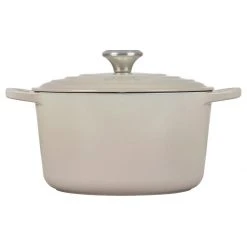 - Interior sand-colored enamel has a smooth finish that promotes caramelization while it prevents sticking and resists staining