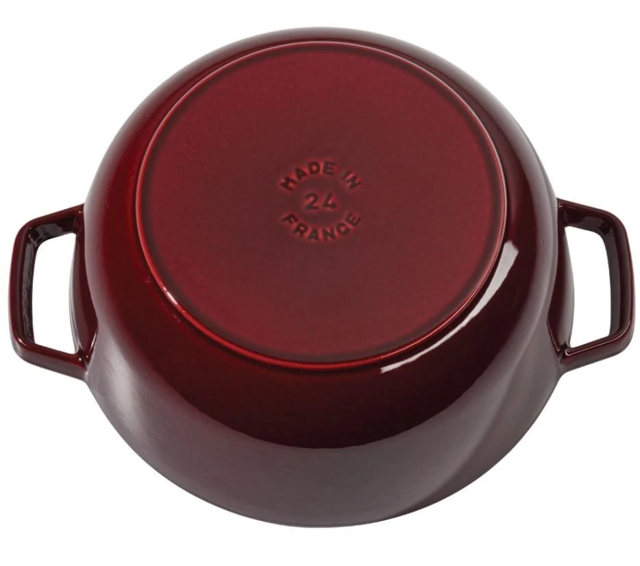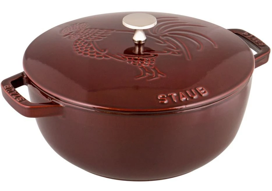 Cook hearty stews, savory casseroles, or delicious cobblers with Staub’s Essential 3.75 Qt Grenadine Cast Iron Rooster Cocotte/Dutch Oven! The traditional round design paired with a lid that has built-in Chistera spikes enables self-basting to continuously keep food moist. The easy-to-clean cast iron cookware distributes and retains heat and does not require seasoning. The matte black enamel interior heats and enhances caramelizing and is excellent for searing. The lovely rooster engraved on top is the perfect touch of character for your kitchen. Try your hand at ratatouille, risotto, or roasts in your very own Staub Essential 3.75 Qt Grenadine Cast Iron Rooster Cocotte/Dutch Oven!