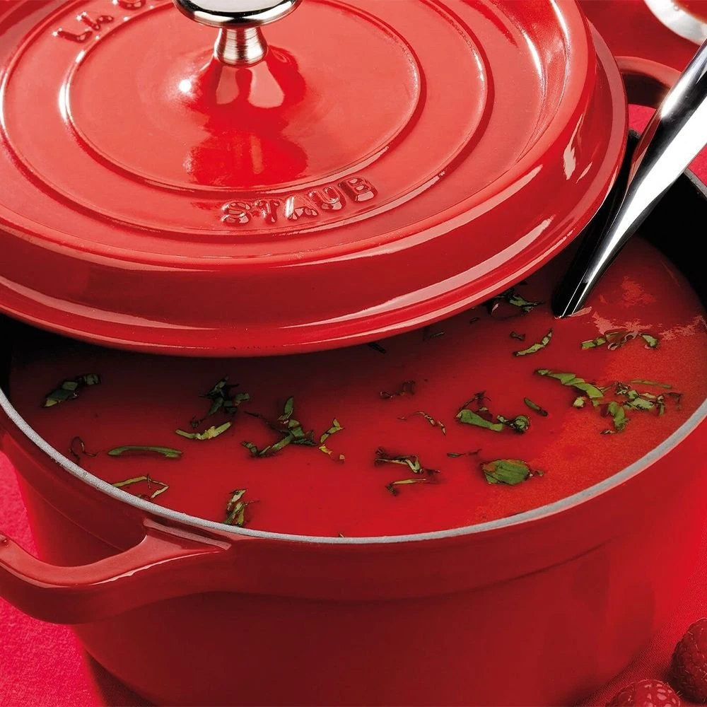 Bring your family together with hearty roasts and soups with the Staub Round Cocotte also known as a French or Dutch Oven. Crafted from strong, durable cast iron this heavy weight dutch oven will be your go to cookware for numerous family favorite recipes including but not limited to macaroni and cheese, braised beef and chocolate souffle. The tight-fitting lid retains essential moisture and features Self-Basting spikes that contribute to a more effective basting while you’re cooking. The smooth enamel bottom works on all stovetops and is oven safe up to 500 degrees Fahrenheit. With no seasoning needed you can start making dinner meals and desserts everyone will love. The lovely cherry color and chip-resistant finish makes for a perfect centerpiece while serving and with a lifetime warranty you can expect to have this wonderful Staub Round Cocotte/Dutch Oven to pass down to generations in your family.