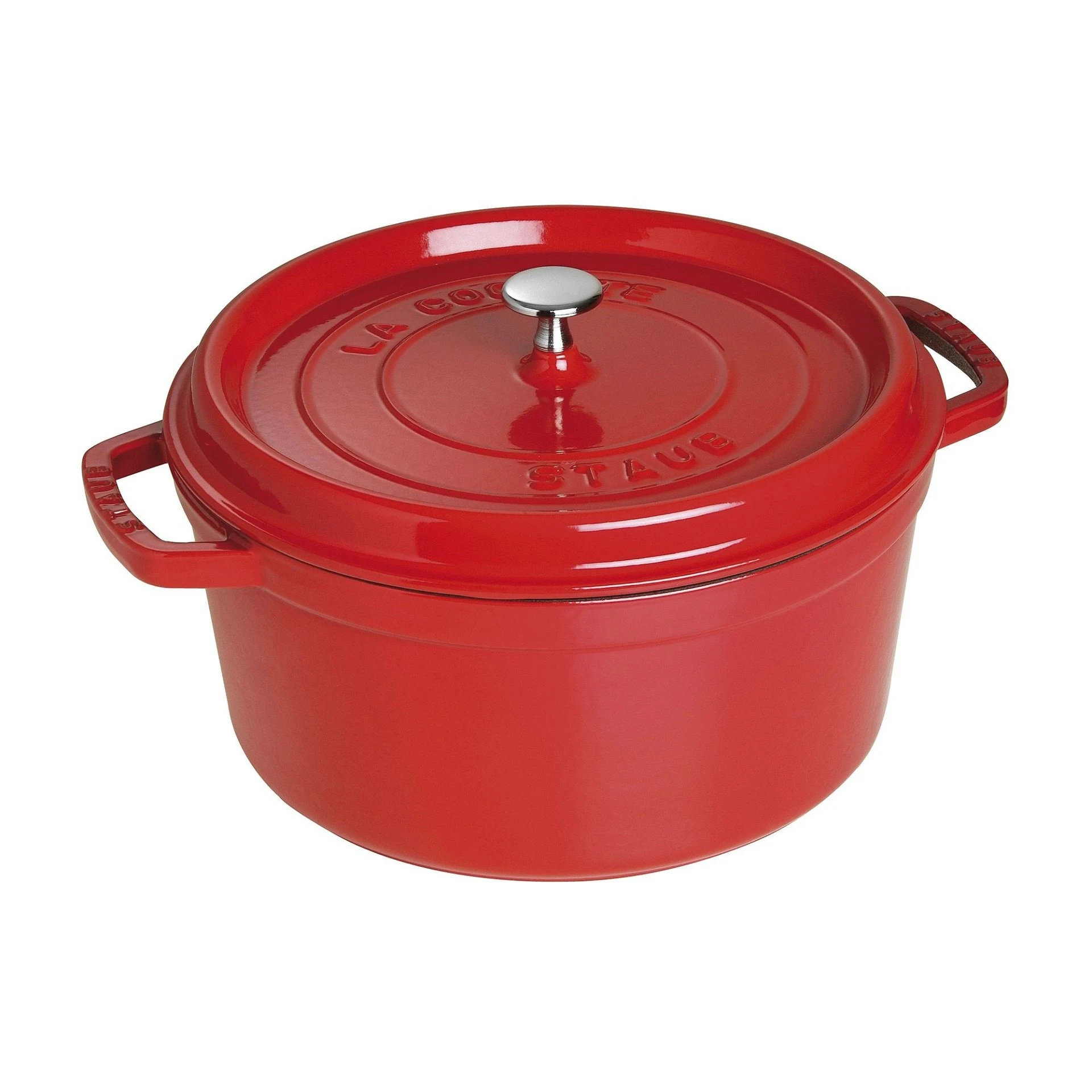 Bring your family together with hearty roasts and soups with the Staub Round Cocotte also known as a French or Dutch Oven. Crafted from strong, durable cast iron this heavy weight dutch oven will be your go to cookware for numerous family favorite recipes including but not limited to macaroni and cheese, braised beef and chocolate souffle. The tight-fitting lid retains essential moisture and features Self-Basting spikes that contribute to a more effective basting while you’re cooking. The smooth enamel bottom works on all stovetops and is oven safe up to 500 degrees Fahrenheit. With no seasoning needed you can start making dinner meals and desserts everyone will love. The lovely cherry color and chip-resistant finish makes for a perfect centerpiece while serving and with a lifetime warranty you can expect to have this wonderful Staub Round Cocotte/Dutch Oven to pass down to generations in your family.